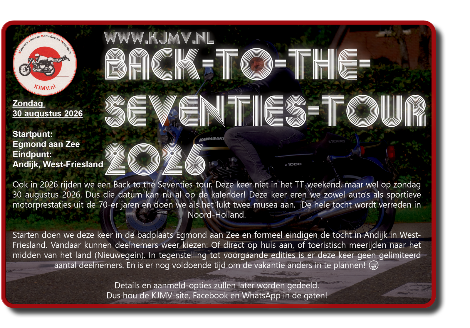 Ook in 2026 rijden we een Back to the Seventies-tour. Deze keer niet in het TT-weekend, maar wel op zondag 30 augustus 2026. Dus die datum kan nu al op de kalender! Deze keer eren we zowel auto’s als sportieve motorprestaties uit de 70-er jaren en doen we als het lukt twee musea aan. De hele tocht wordt verreden in Noord-Holland.