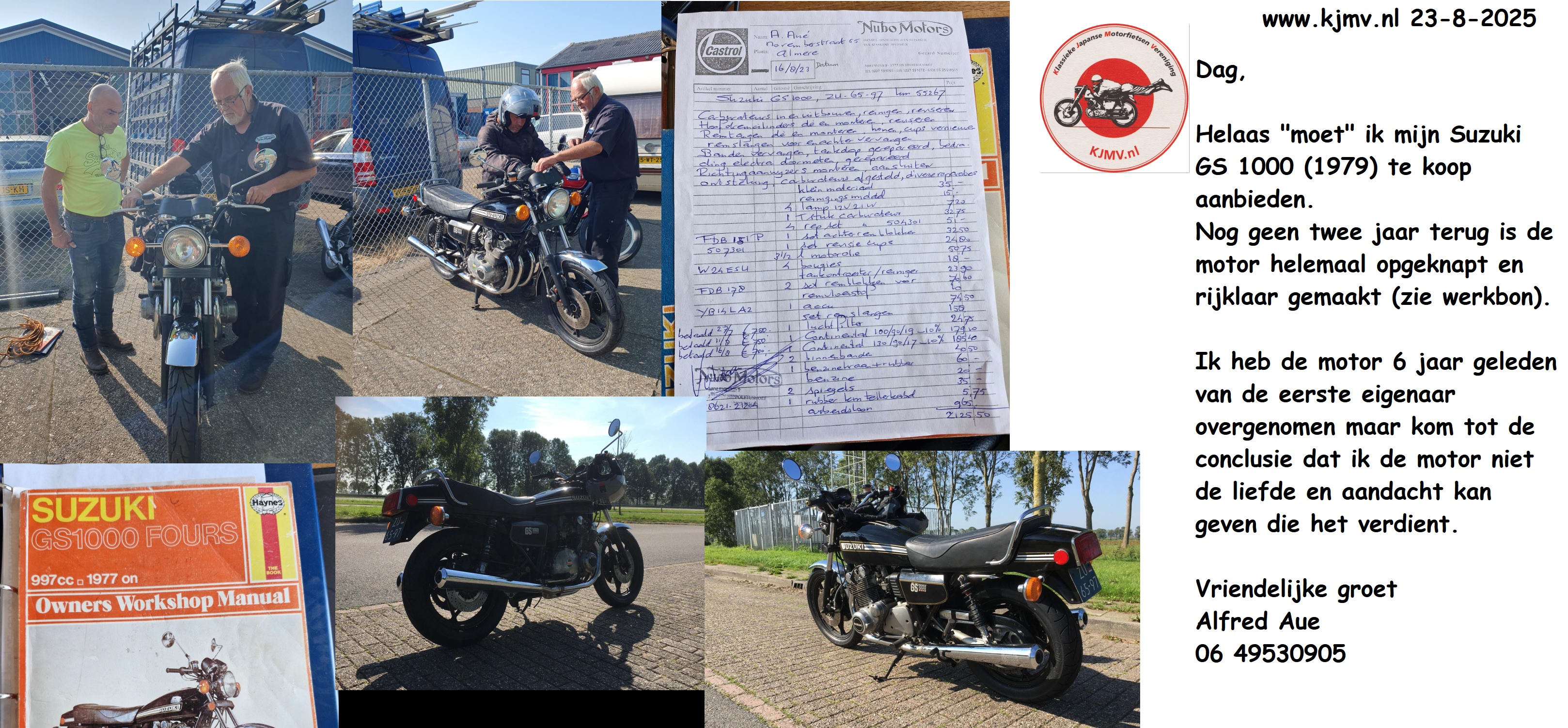 Helaas "moet" ik mijn Suzuki GS 1000 (1979) te koop aanbieden. Nog geen twee jaar terug is de motor helemaal opgeknapt en rijklaar gemaakt (zie werkbon). Ik heb de motor 6 jaar geleden van de eerste eigenaar overgenomen maar kom tot de conclusie dat ik de motor niet de liefde en aandacht kan geven die het verdient.
